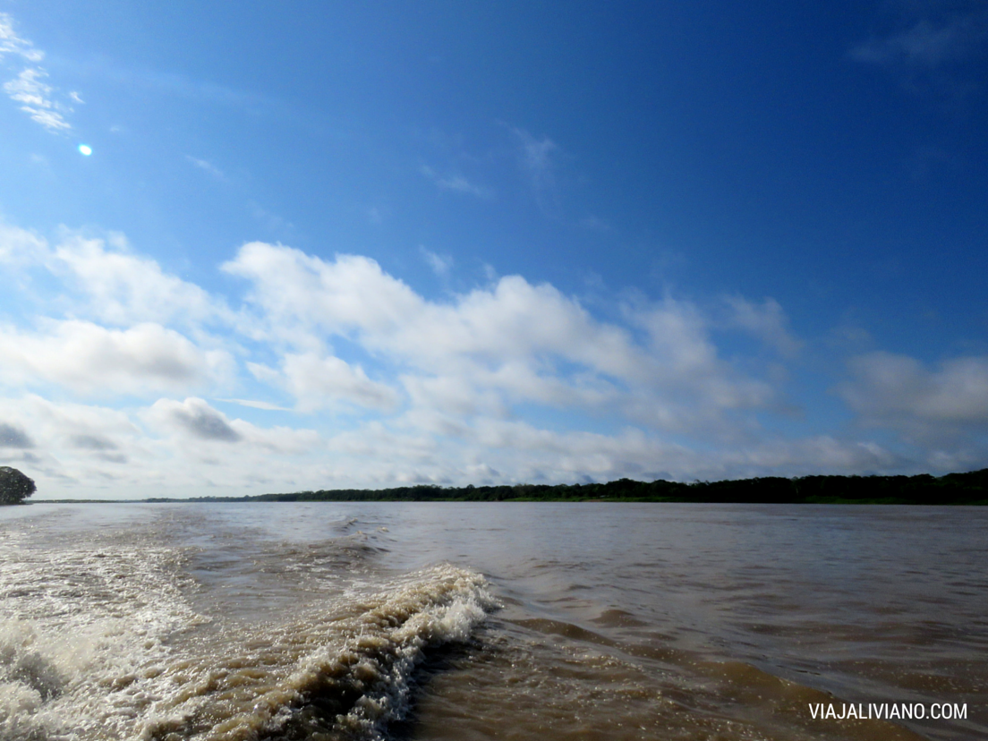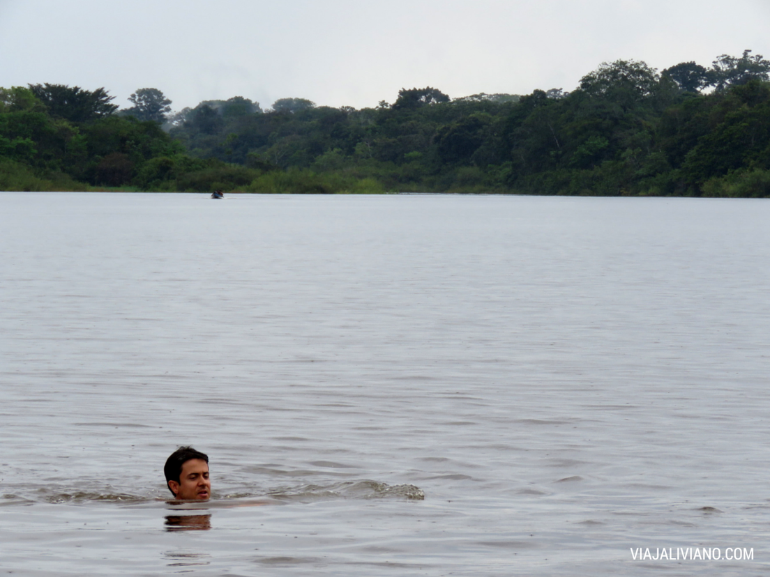 El río Amazonas representa un 20% del agua dulce del planeta. Es tan ancho que tiene grandes islas y en algunos lugares durante la temporada de lluvias puede tener hasta 48 km de distancia entre las dos orillas (la desembocadura es un estuario de 240 km de ancho), el sólo hecho de ver esta gran masa de agua moviéndose es una experiencia única. Sin embargo, a pesar de lo que se podría pensar de un río tan grande, en el lugar en que nosotros estábamos, el Amazonas discurre lenta y tranquilamente, arrastrando enormes troncos de árboles. David y su hermano Lucas vivieron la experiencia de nadar por un rato en este ecosistema, en la quebrada Pacatua y en el Lago Tarapoto (lugares que hacen parte de la cuenca del Amazonas, pero que no son el Río Amazonas).
