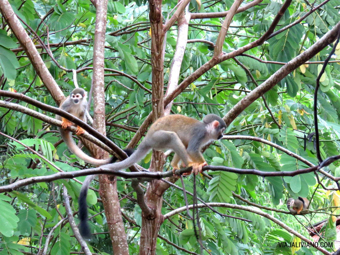 En las pasarelas del hotel pudimos ver en varias ocasiones los Monos Ardilla y en una oportunidad algunos Monos de Cola Amarilla. Estos monos se mueven libremente por los alrededores del hotel y es importante no darles alimentos humanos ya que pueden enfermarlos y los hace más vulnerables frente a posibles cazadores (al familiarizarse con los humanos pierden su desconfianza natural y es más fácil capturarlos).