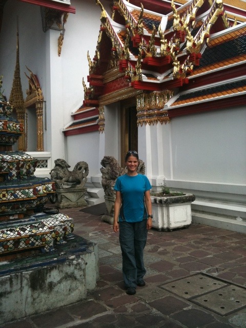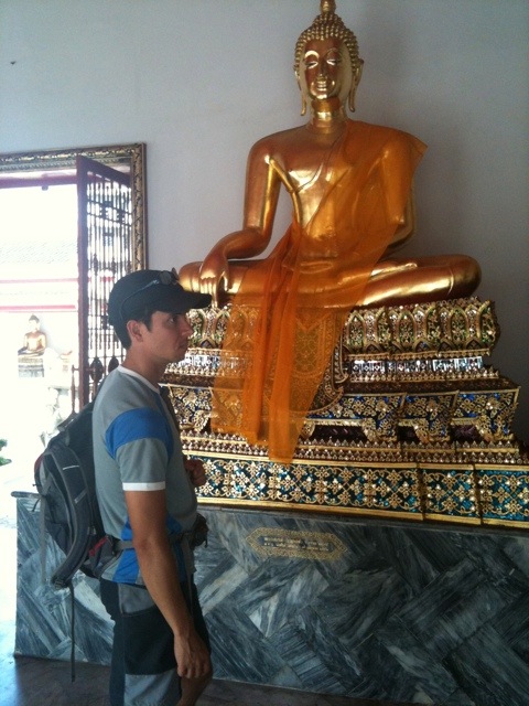 En cuanto nos bajamos del bote (afortunadamente era en la última parada porque los nombres sólo estaban escritos en Tai), nos acercamos a un tuk-tuk para pedirle que nos llevara al Gran Palacio. Allí nos abordó un personaje (el mundo está lleno de touts!) y nos dijo que estaba cerrado por las oraciones de los monjes (lo cual sabíamos que era una estafa), pero que por 20 bahts nos llevaban a 4 templos y al final nos dejaban en el Gran Palacio. La cosa no sonaba mal, el costo eran menos de USD0.7, y aunque nos parecía que había gato encerrado, aceptamos la oferta (luego leímos en la guía Lonely Planet que esta es una forma de estafa muy común y la verdad es que no estábamos prevenidos y caímos redondos, aunque al final la cosa salió bien).