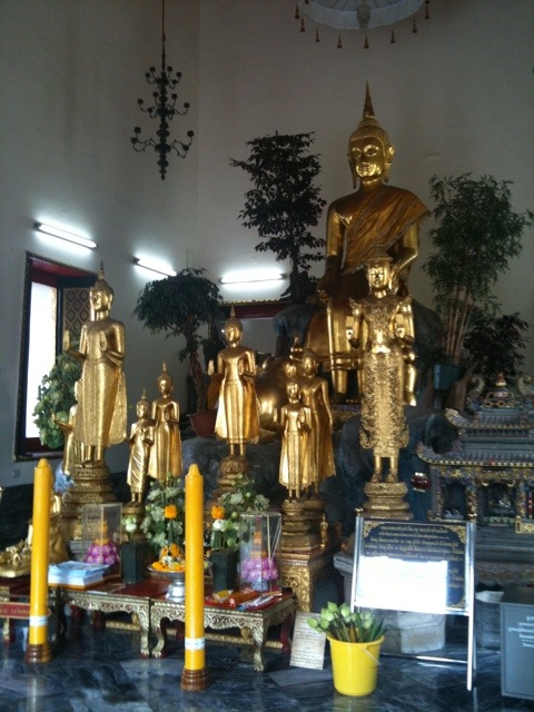 El lugar es enorme, con jardines muy elaborados y templos. Cuando salimos el conductor había desaparecido! Nos dejó allí (ya era claro que no pensábamos ir a ningún otro almacén) sin ni siquiera pagarle los 20 bahts. Buscamos otro tuk-tuk y dijo que la tarifa eran 200 bahts por llevarnos al Gran Palacio. Luego de caminar y regatear logramos uno que nos cobró 60.