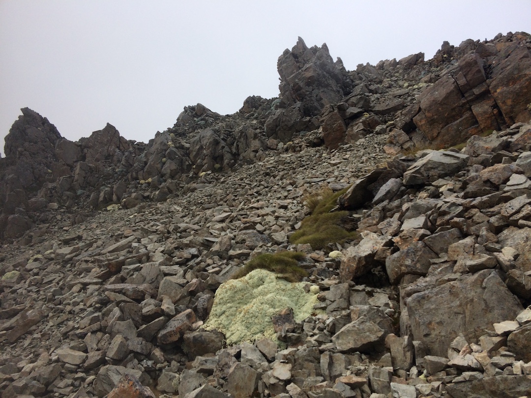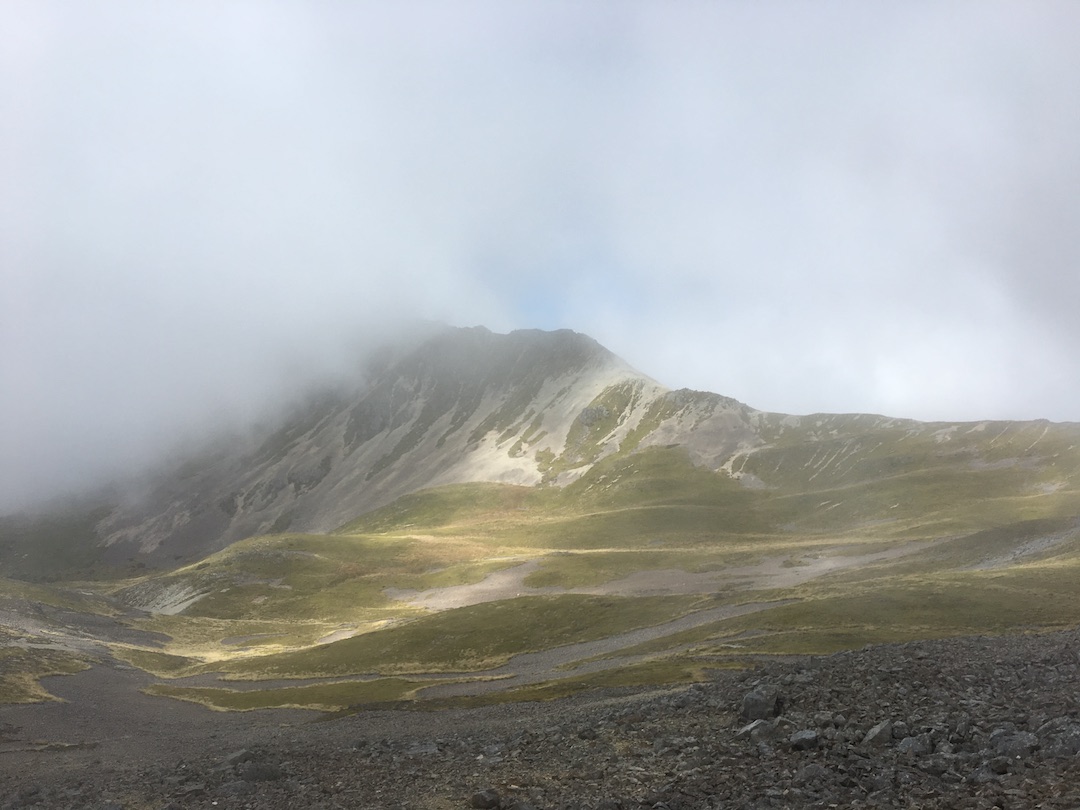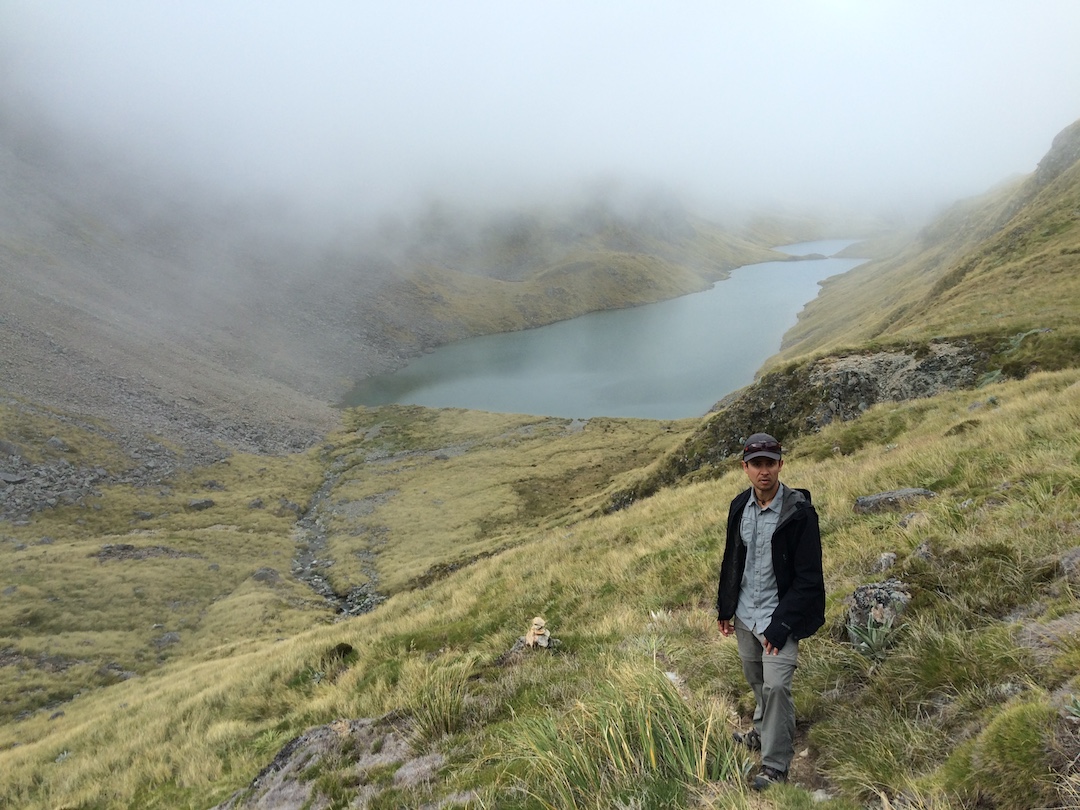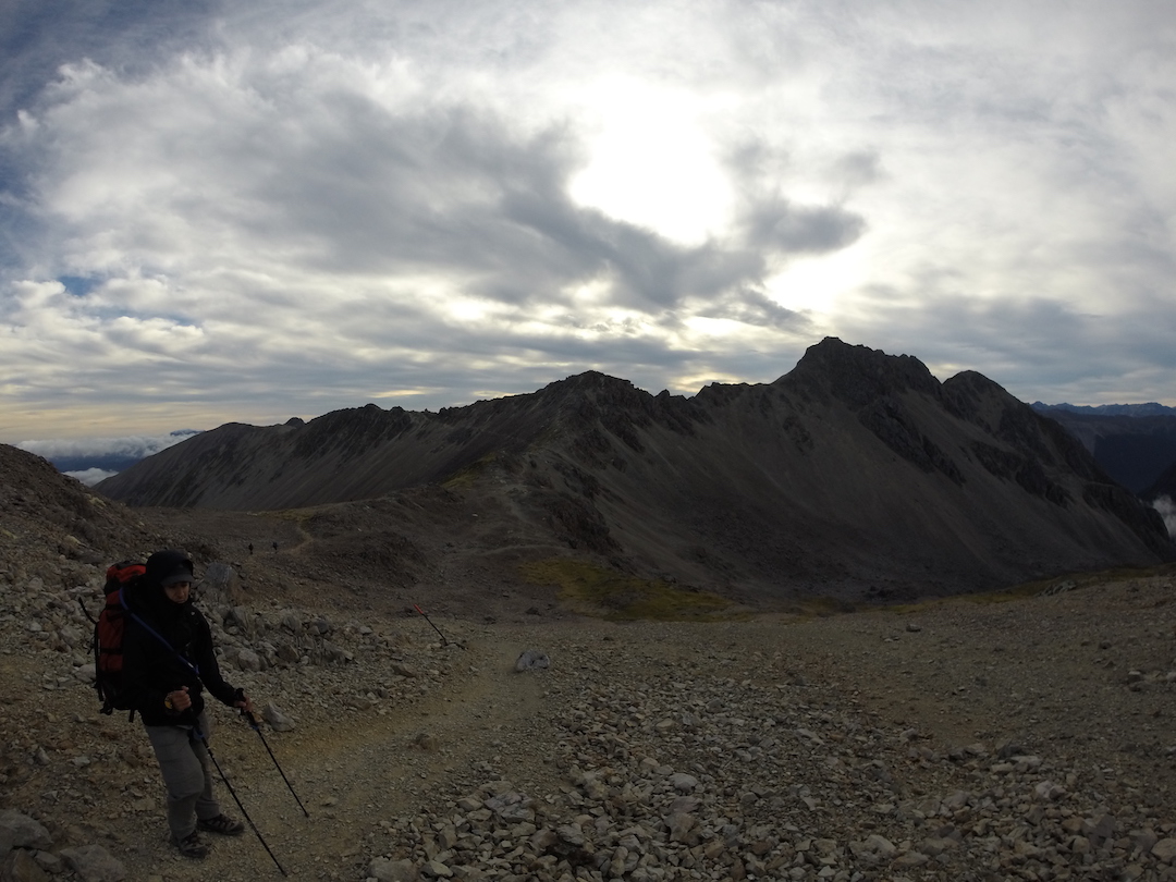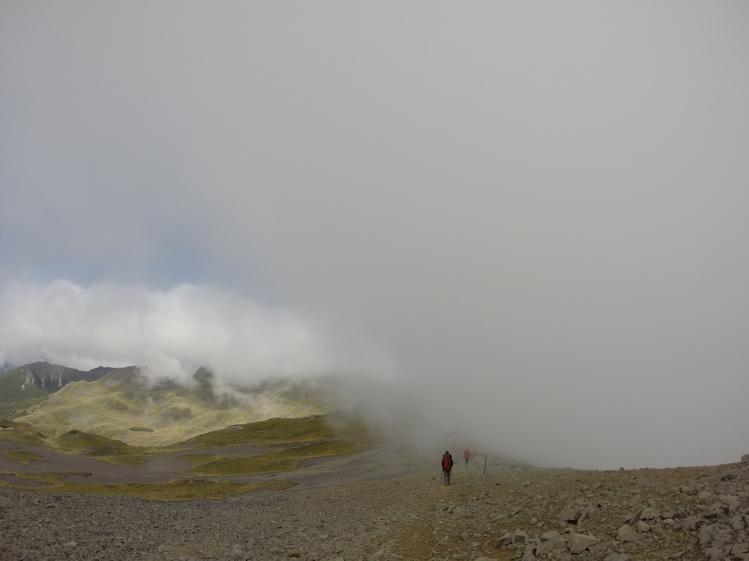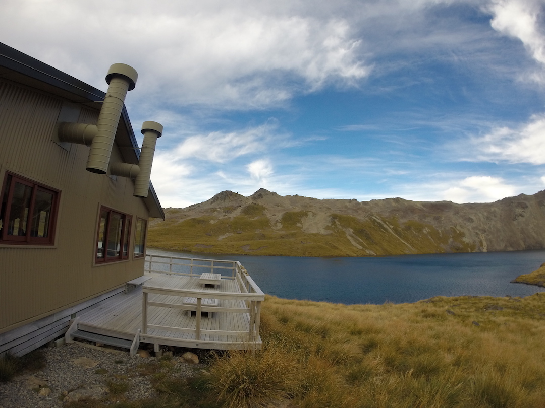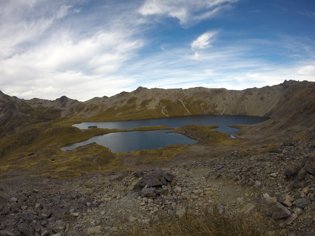 Un último ascenso y llego al caballete. Por unos segundos las nubes desaparecen y puedo ver, al otro lado del filo, un par de lagos conectados, una construcción mediana, otra más pequeña y algunas carpas. Una sonrisa que nadie alcanzó a ver desaparece rápidamente de mi rostro, no pasó nada, pude hacerlo. David me alcanza y descendemos juntos los últimos metros, el letrero de “prohibido las botas en el refugio” nos da la bienvenida: es el Angelus Hut.