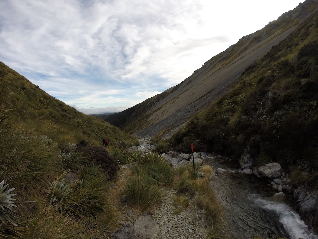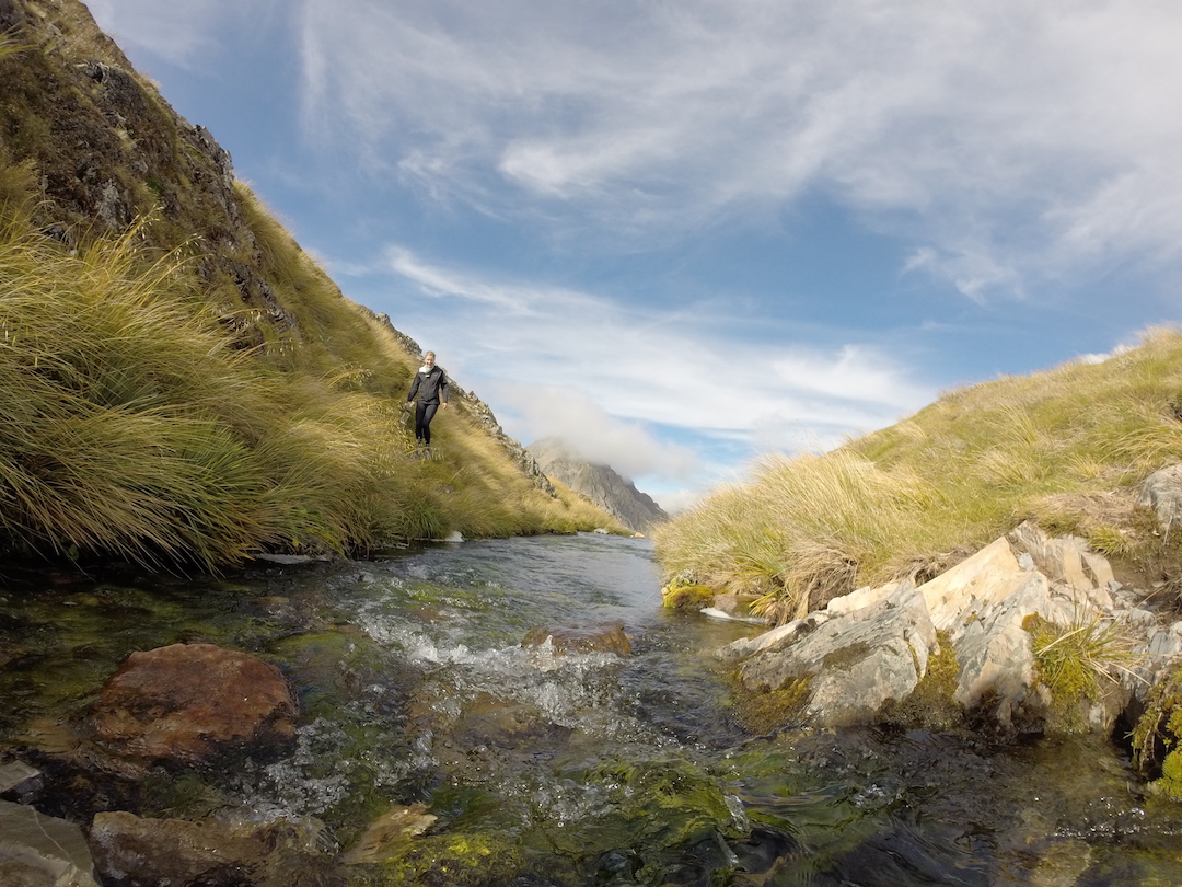 Al día siguiente elegimos devolvernos por el camino llamado Speargrass (11.2 km) el cual trajo nuevos desafíos: el día amaneció menos nublado pero con fuertes vientos, en el caballete casi era imposible quedarse de pie, cruzamos decenas de veces el río (me caí una de ellas), tuvimos que atravesar varios pantanos y al final un bosque.