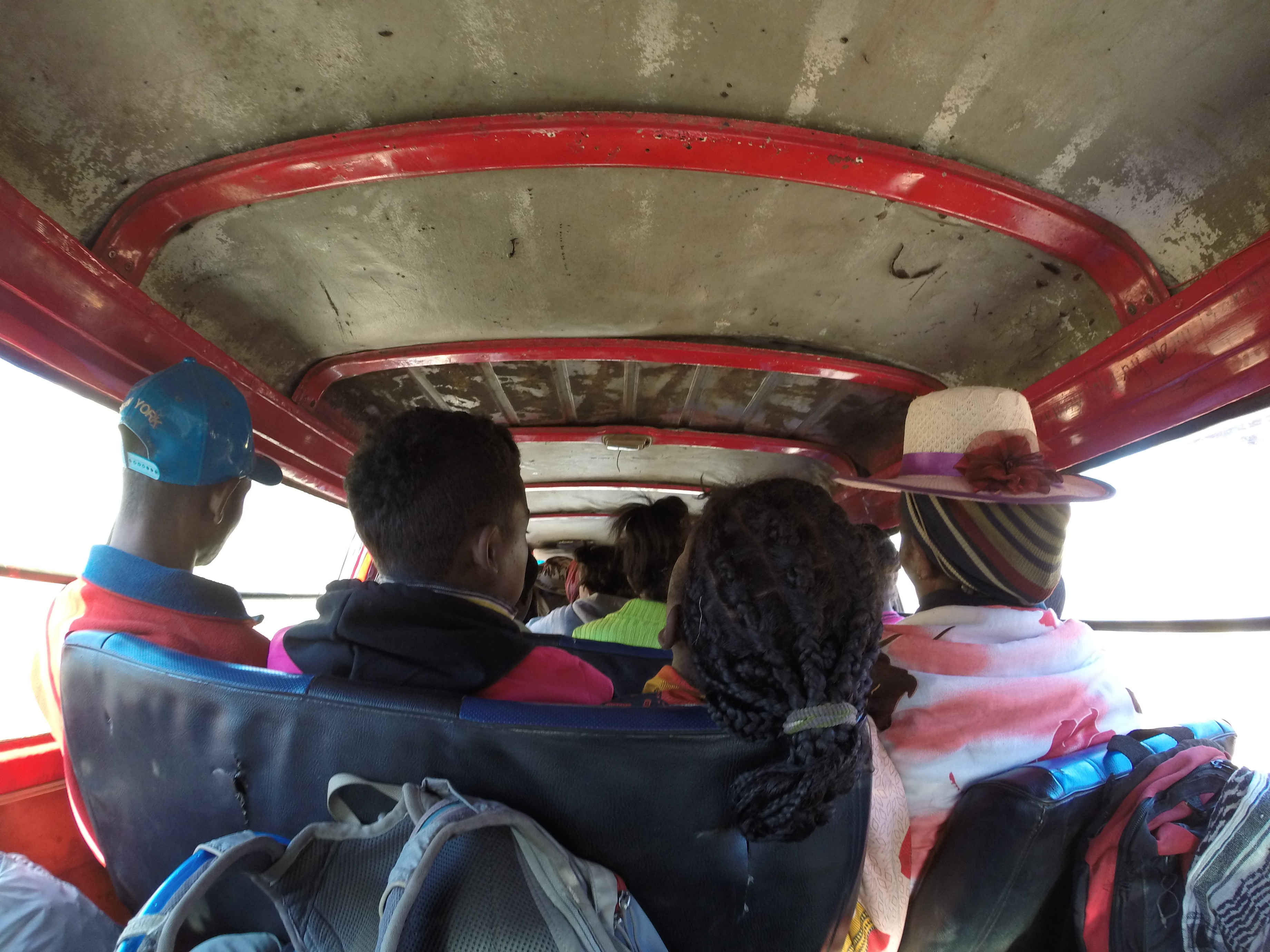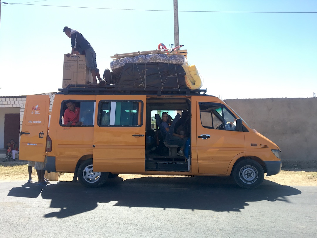 Los mini buses son relativamente cómodos (infinitamente mejores que los que tomamos en países como Malaui o Mozambique) pero los llenan al tope, el equipaje va en el techo, compartiendo espacio con muebles, bultos de comida y hasta animales.