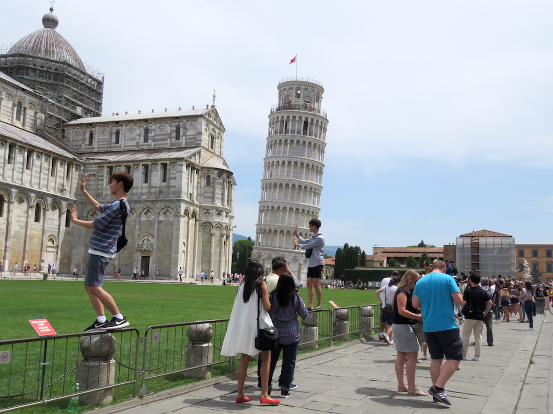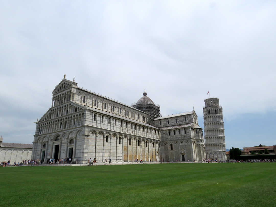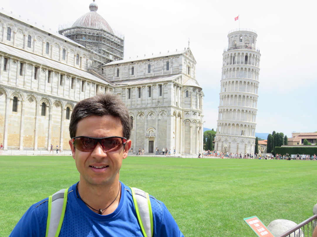 Pisa es fácilmente reconocida por su famosa torre inclinada, la cual tiene una desviación de 3.9º con respecto a la vertical. Dicho así parece poco ¿no? pero el efecto es considerable. Se trata del campanario de la catedral y su construcción tomó más de 200 años. Alrededor de la torre (la cual puede ser visitada por máximo 40 personas al tiempo) se encuentra la catedral (Duomo), el baptisterio (Battistero) y el cementerio (Camposanto). Sin mucha pena ni gloria, tomamos las fotos representativas y seguimos nuestro camino.