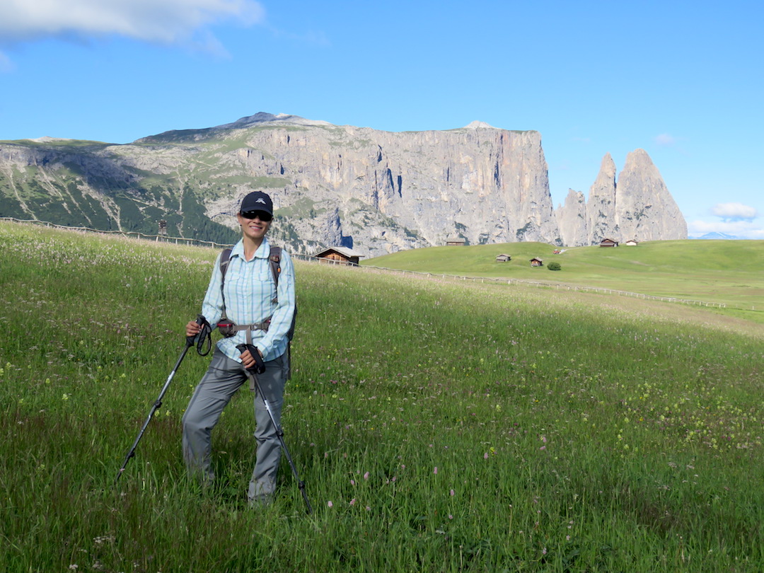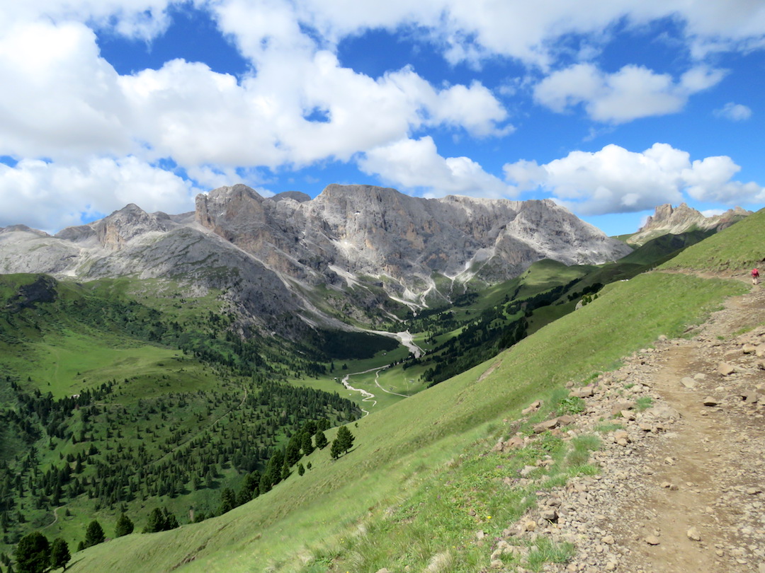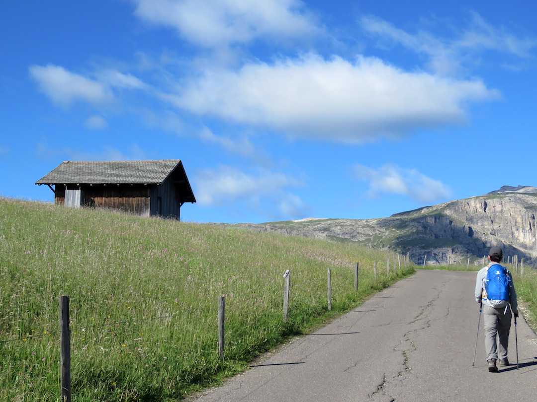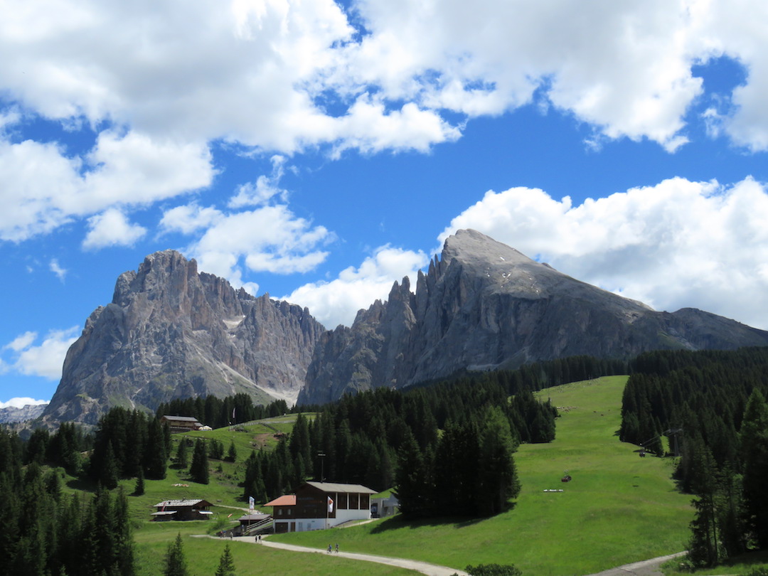 El circuito que hicimos en esta ocasión requirió que tomáramos un teleférico hasta el punto de inicio en la aldea de Compatsch. El camino no llevó por una carretera pavimentada por unos 5 kilómetros, hasta el punto de ascenso al refugio Sasso Piatto cuyo camino enfrentó la inmensa formación rocosa que hasta entonces teníamos de frente y nos condujo por todo su filo.