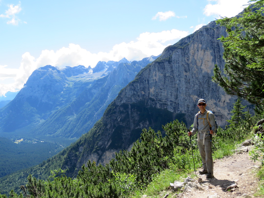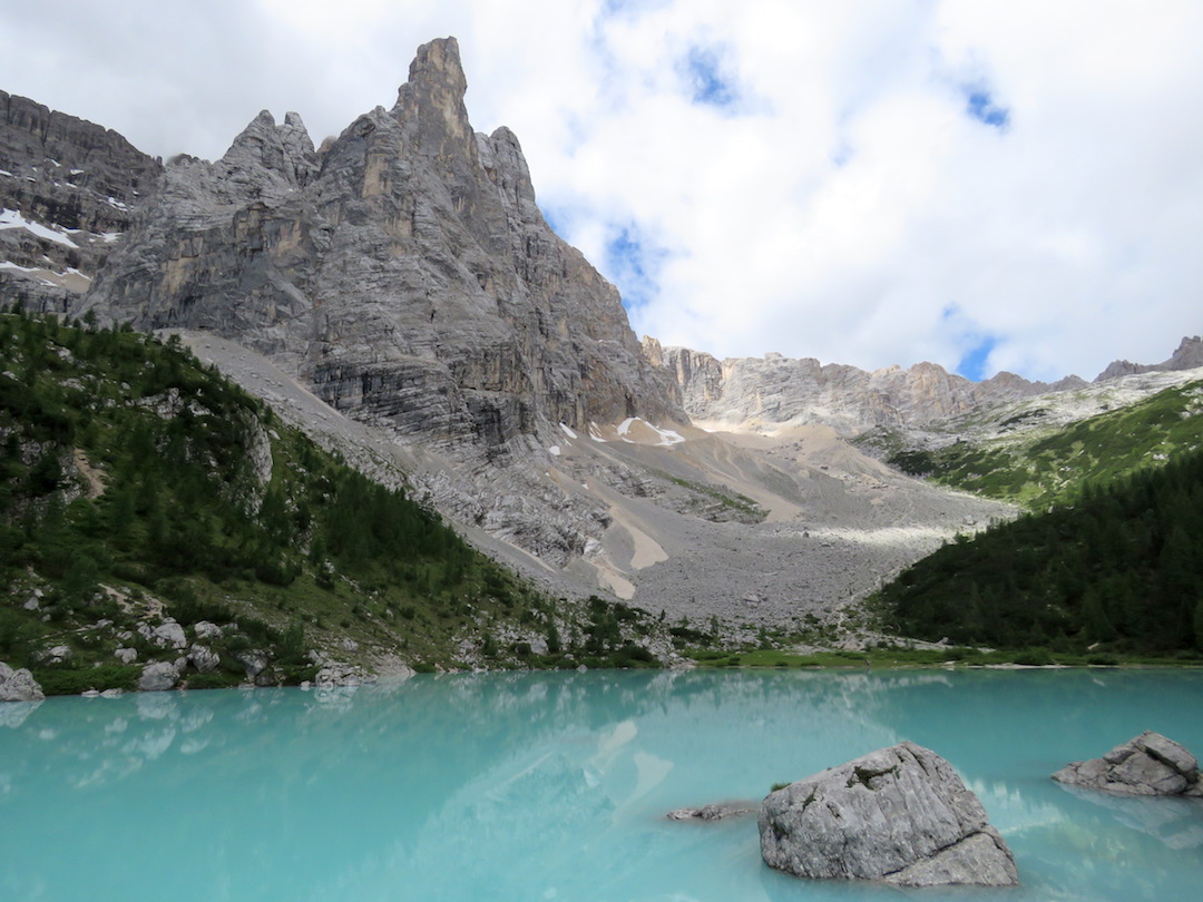 Con ganas de más caminatas, buscamos, en la mañana siguiente un sendero más largo. Escogimos el circuito del Lago di Sorapis que comienza al borde de carretera en un lugar llamado Paso Tres Cruces. En esta ocasión, el camino se tornó mucho más interesante que el día anterior. El ascenso hacia el refugio Vandelli estuvo colmado de hermosos paisajes con una vista excepcional del cañón. Una vez arriba, el Lago di Sorapis bien nos supo sorprender por el color azul turquesa de sus aguas.