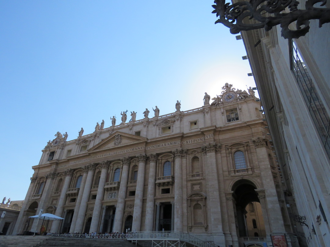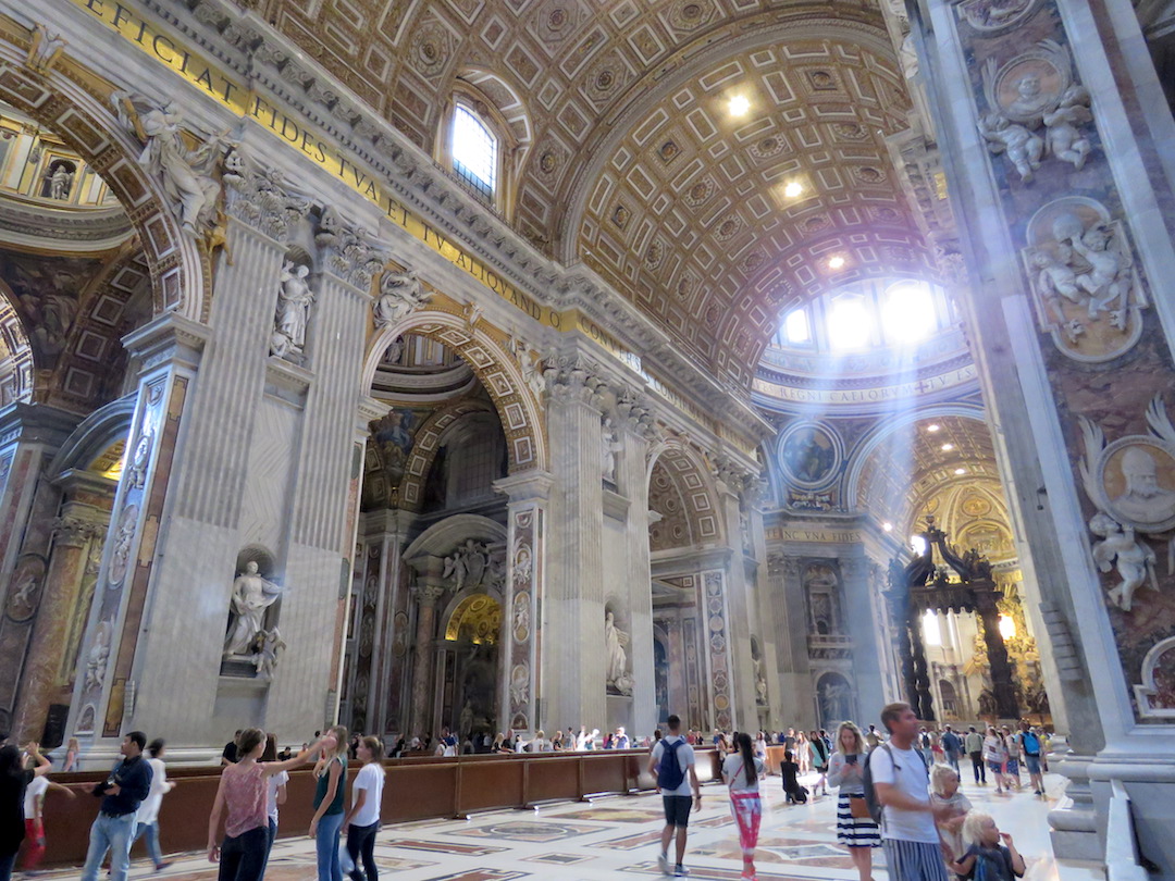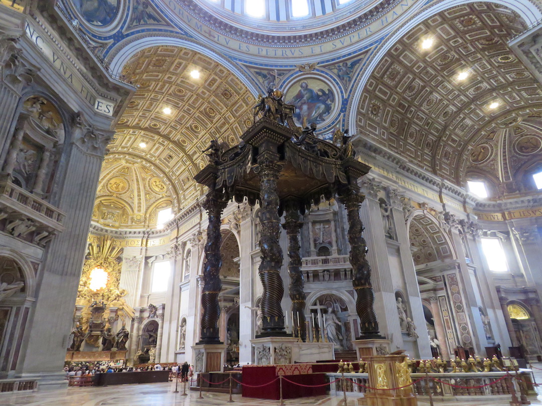 Nuestro día culminó visitando La Basílica de San Pedro. Bien vale la pena los 40 minutos de fila que tuvimos que hacer para apreciar la que se dice es la basílica más grande, rica y espectacular de todo Italia y probablemente de todo el mundo. Esta basílica es el resultado de la que se construyó en el año 349 sobre la tumba del mismo Pedro, apóstol fundador de la Iglesia Católica y luego reconstruida hasta sus dimensiones actuales por 120 años entre los siglos 14 y 15. A parte de sus impresionantes dimensiones con hermosas paredes de mármol, en el lugar se encuentran muchas bellas esculturas incluyendo la famosa Piedad de Miguel Ángel. No menos espectacular, son las muchas tumbas de los Papas pasados que, contrario al votos de pobreza que que debe hacer el cuerpo clérigo de la Iglesia Católica, muestran un derroche de recursos apenas comparable con los de las tumbas faraónicas.