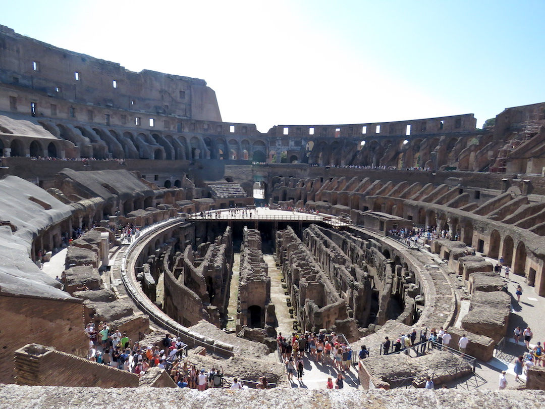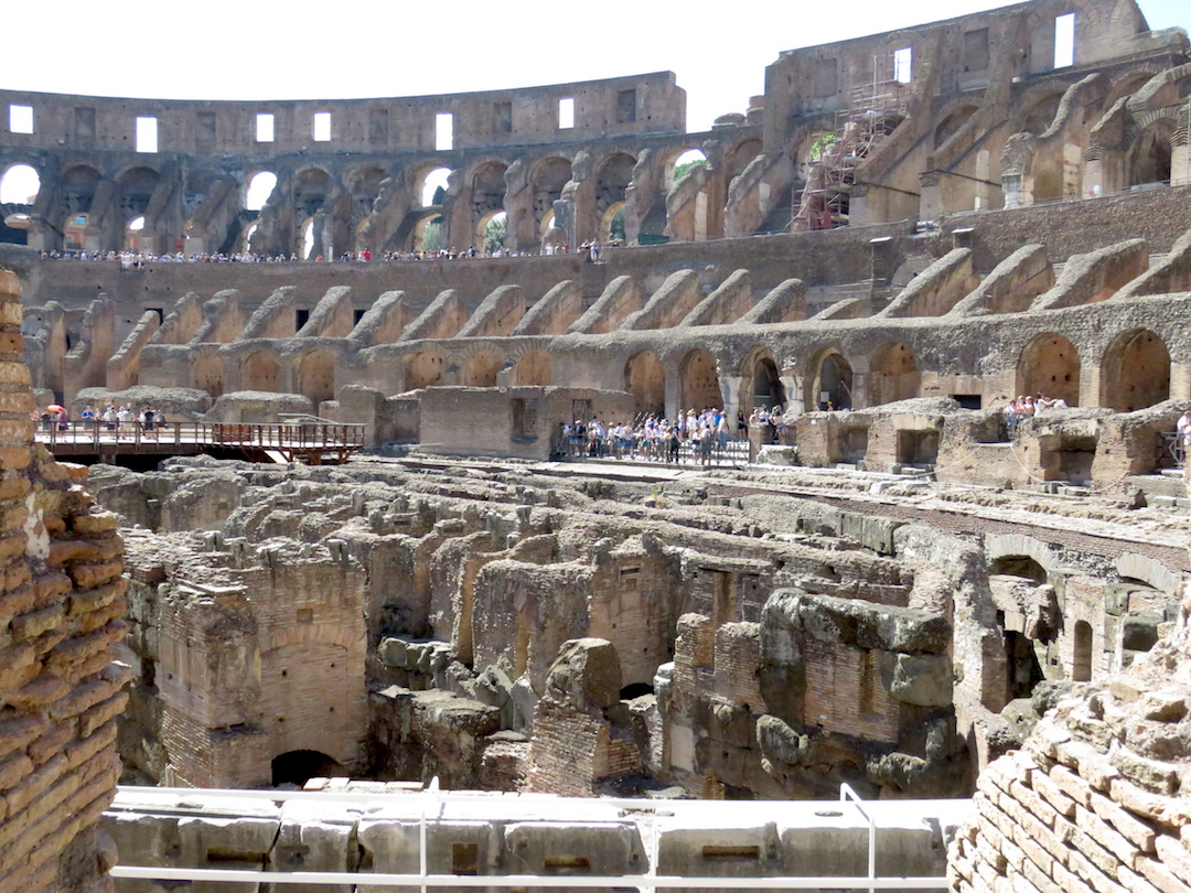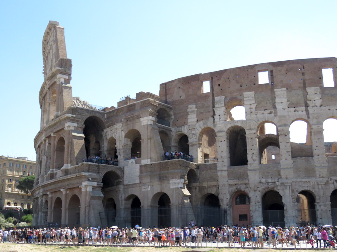 Nuestro primer destino fue el Coliseo Romano. Habíamos comprado los pases días antes por internet, muy recomendable por la cantidad de turistas que lo visitan especialmente en esta época del año, lo cual nos permitió dirigirnos de inmediato a la taquilla y evitar la larga fila que, dando apenas las 8:30 de la mañana, ya se formaba dando la vuelta a la mitad del perímetro de la plaza. La audioguía que alquilamos nos supo llevar por las principales zonas de la estructura y narrar algunos acontecimientos históricos interesantes que han sido plasmados en cualquier guía de viaje.