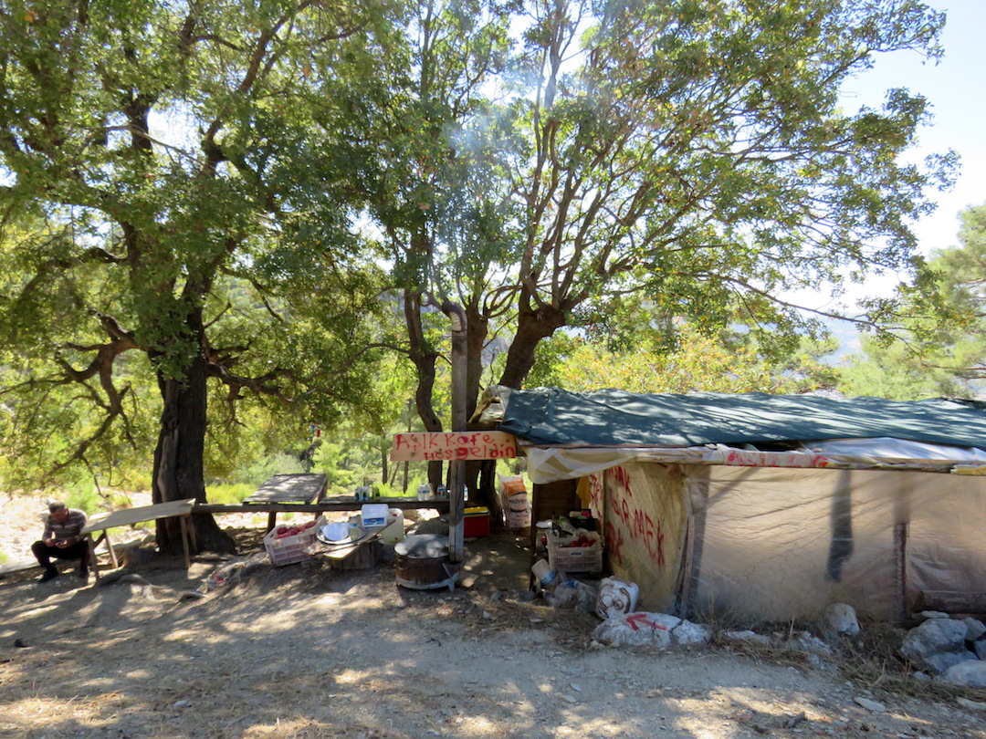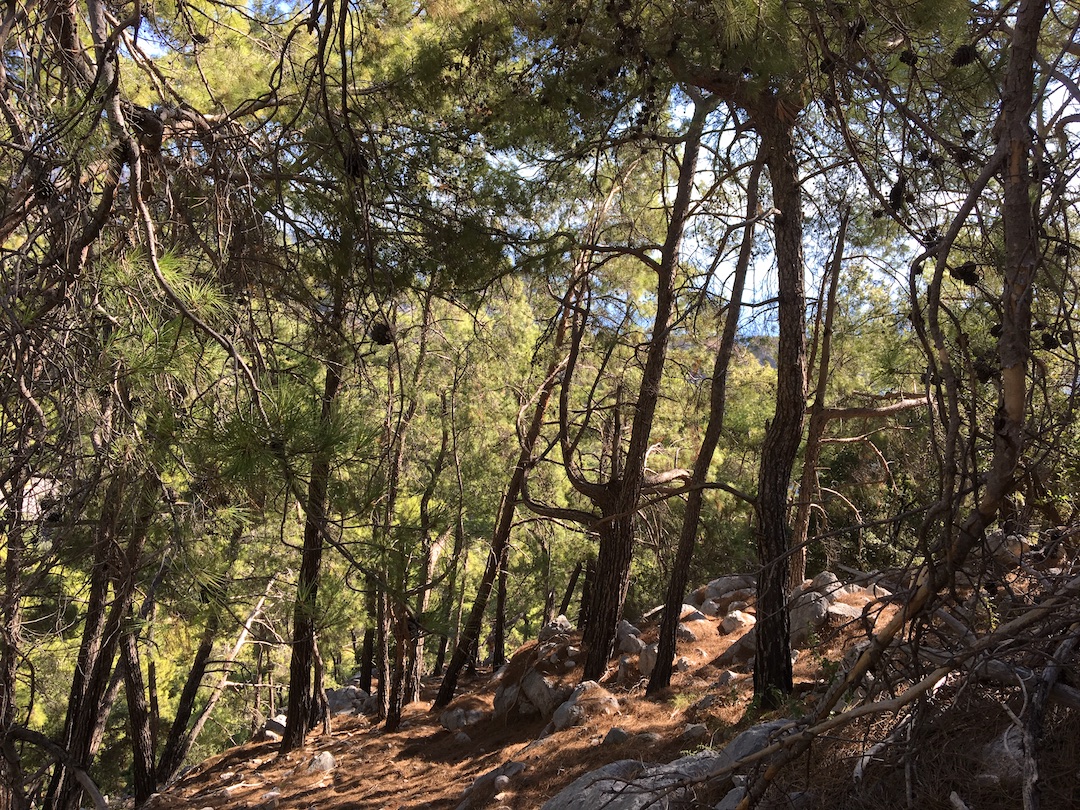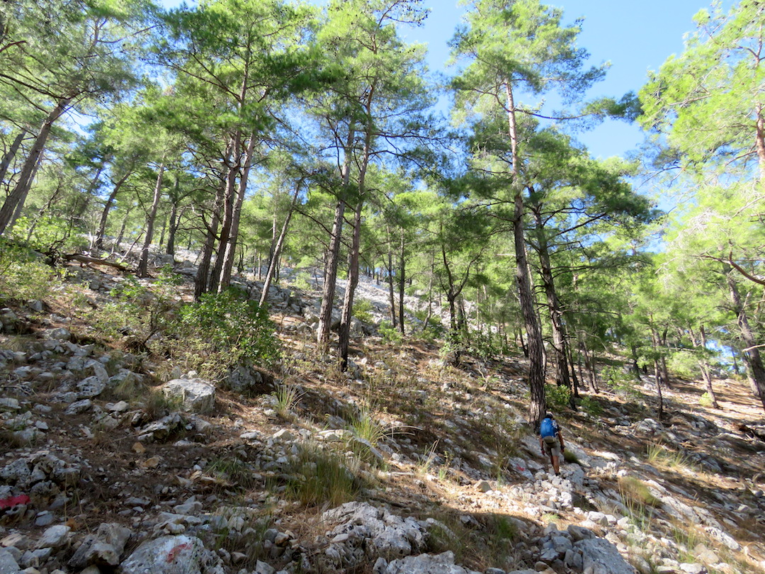 Esta caminata comienza con un ascenso hacia la montaña que rodea Kas lo cual ofrece una hermosa vista hacia la ciudad. Desde ahí caminamos por un valle hasta Cukurbag (un tramo algo monótono) y finalmente en Pinarbasi subimos a las ruinas de Phellos. En el camino nos encontramos a un grupo de chicos que estaba cocinando salchichas y compartieron con nosotros (a pesar de apenas hablar inglés).