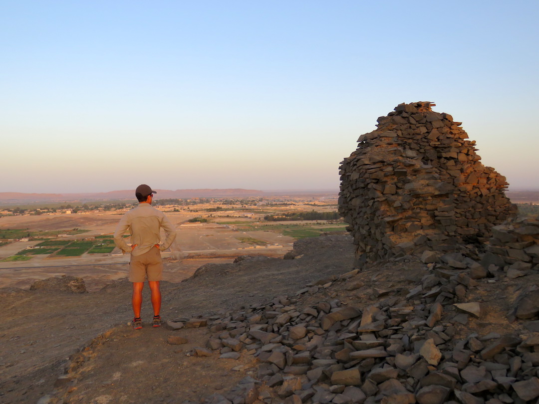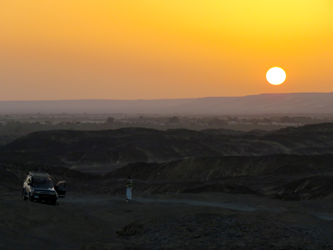 Nuestro siguiente destino fue la pirámide natural, una montaña que desde lejos efectivamente parece una de las tumbas construidas por los faraones. Desde allí pudimos tener una hermosa vista de la zona. A pocos kilómetros estaba la piscina artificial formada por el agua subterránea del oasis la cual usan los locales (y visitantes) para darse un baño, pero a pesar de ser muy atractivo con el calor que hacía afuera lo cierto es que el agua también estaba caliente y no era refrescante. Terminamos el día viendo el atardecer en la montaña El Inglés donde hay unas pequeñas ruinas, vestigios de la cabaña construida hace algunos años en este lugar.