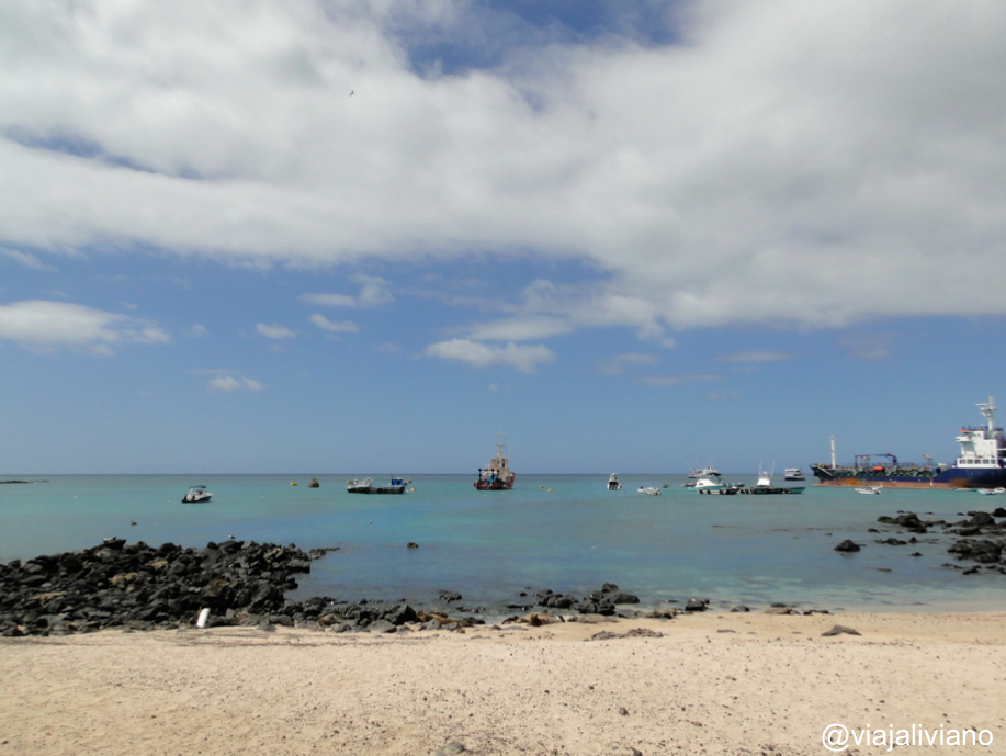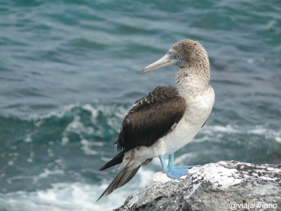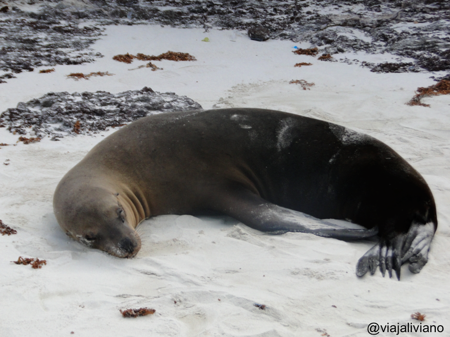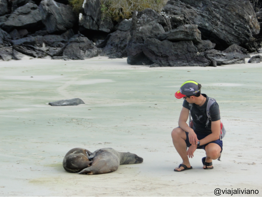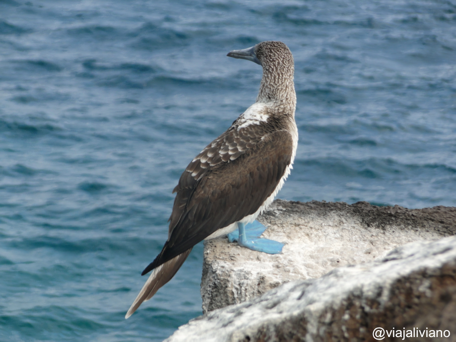 Siguiendo la misma carretera llegamos a Puerto Chino. Luego de unos 10 minutos de caminata desde el estacionamiento nos encontramos con una pequeña bahía de arena suave y clara con algunos lobos marinos (quienes ni quiera se inmutaban por nuestra presencia). Allí las familias disfrutaban del atardecer jugando a la pelota o bañándose en el mar. Por sugerencia de Carlos hicimos un camino al lado derecho de la playa que nos llevó hasta unas rocas donde se pueden ver los Piqueros de Patas Azules, después de las tortugas gigantes posiblemente sean los animales más conocidos de las islas. Lo que más me impresionó fue su tamaño, siempre en las fotos me parecían aves pequeñas pero en realidad (de pie) miden unos 40-50 cm. Evidentemente el color de sus patas es muy llamativo.