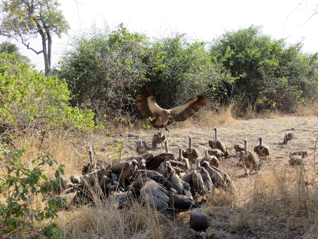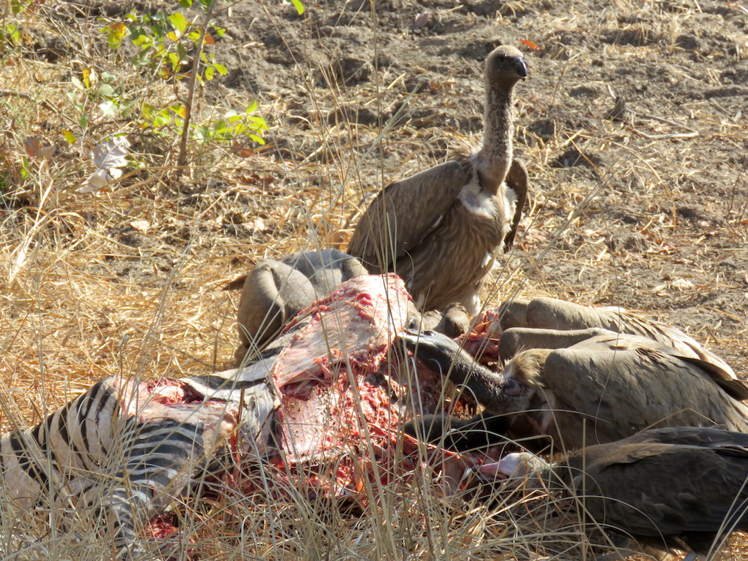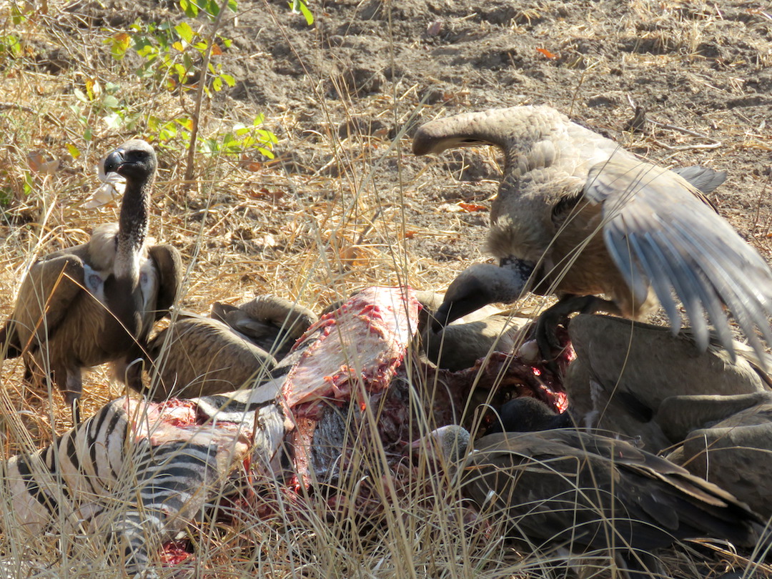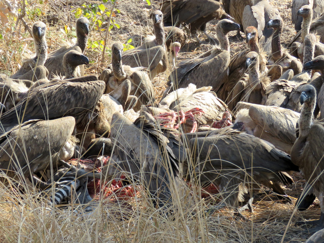 Buitres comiéndose una zebra que fue cazada en la noche por los leones y sirvió después de desayuno de las hienas
