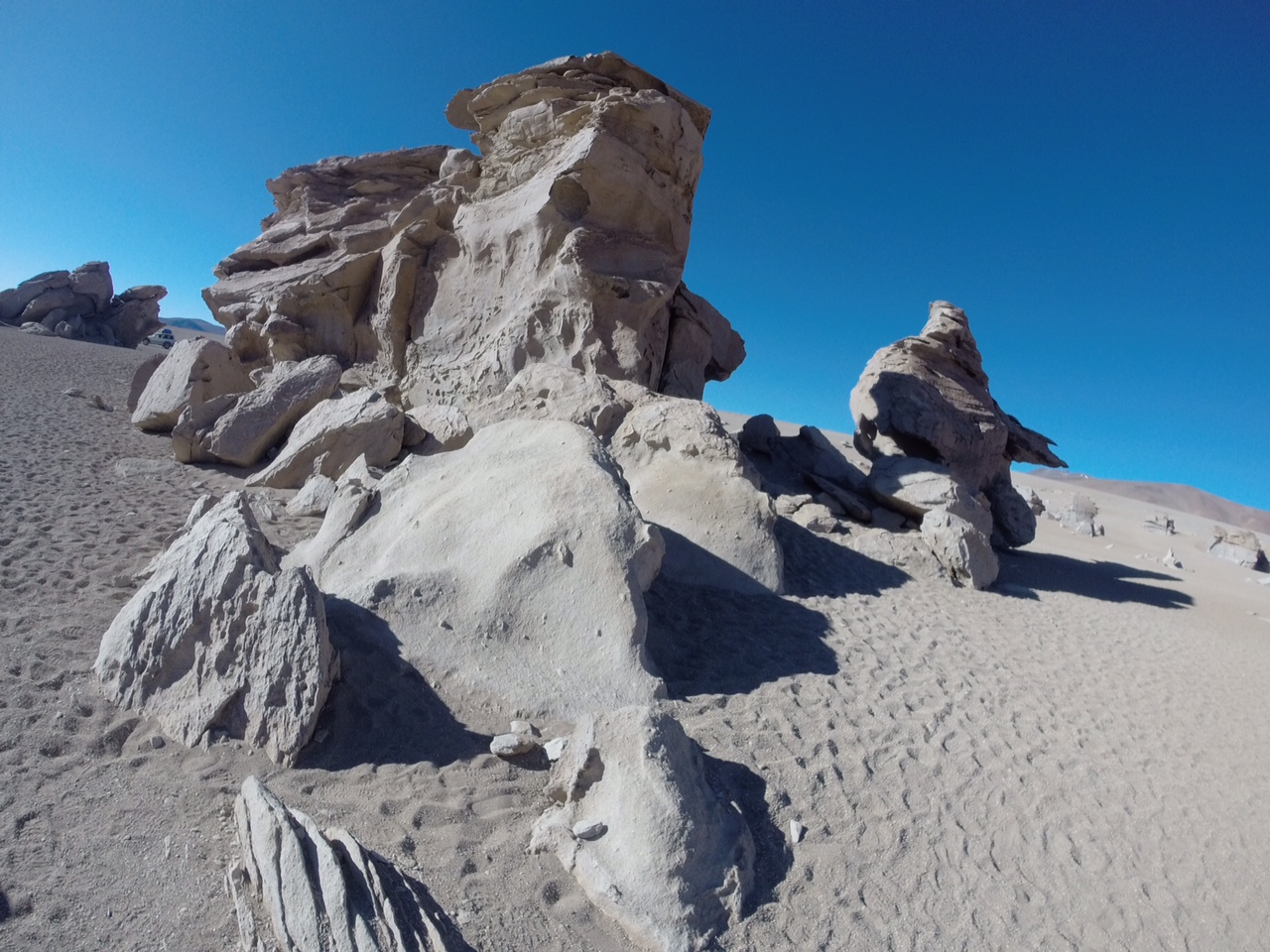 Después de pasar la noche en el hotel construido con bloques de sal, tomamos el desayuno que nuestro guía nos trae por pasos, se ha quedado dormido y el queso llega media hora antes que el pan y los huevos solo aparecen cuando nos estamos levantando de la mesa. Aún así es un privilegio tener esta comida caliente en un lugar tan inhóspito.