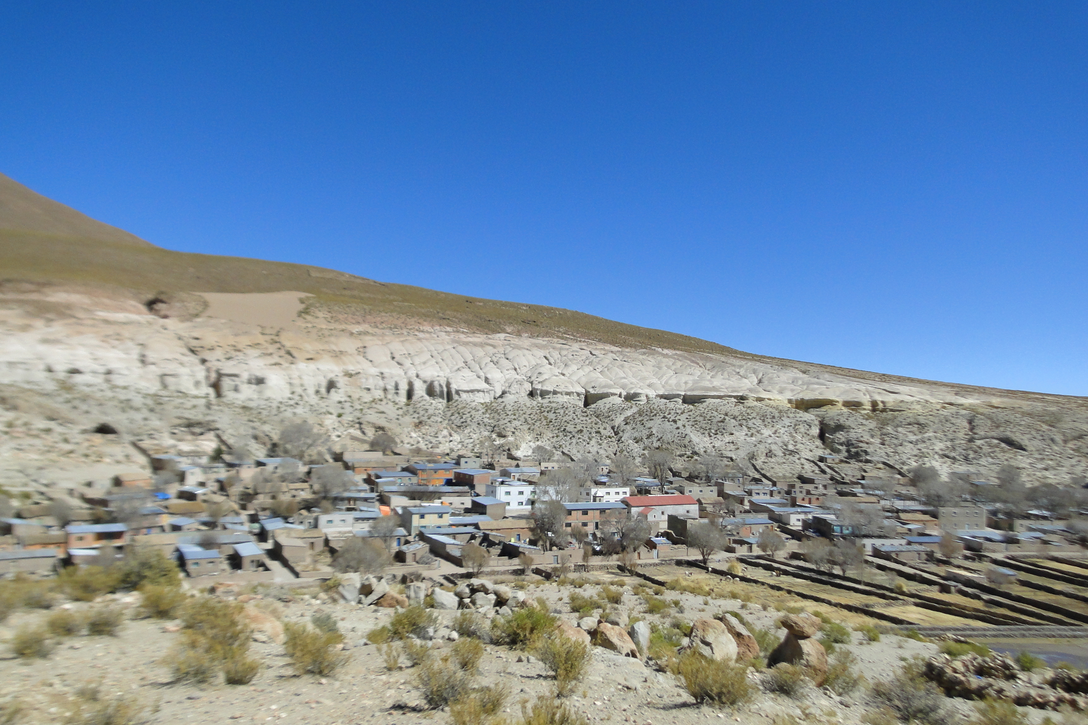 Hacemos un par de paradas en pequeñas poblaciones para entrar al baño y es asombroso como todas ellas parecen ciudades fantasma: edificaciones color tierra para las cuales es imposible definir si están construyéndolas o demoliéndolas, calles entierradas donde de repente aparece algún juguete olvidado o un niño curioso que en segundos sale corriendo; una que otra llama, adornada con los colores de su dueño, en busca de hierbajos, que huye asustadiza apenas nos ve. A pesar de la precariedad los baños siempre están impecablemente limpios y las personas sonrientes y amables.