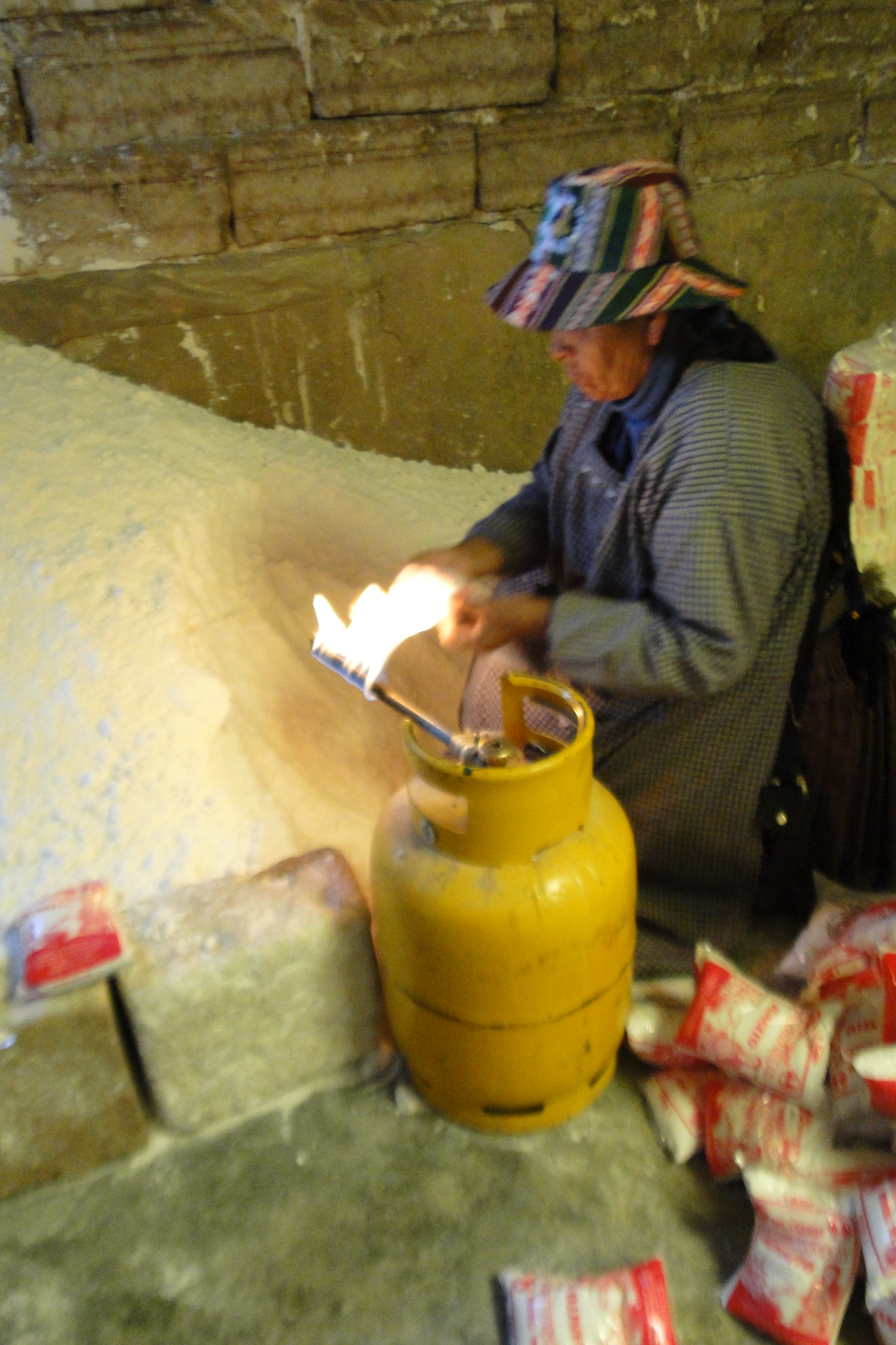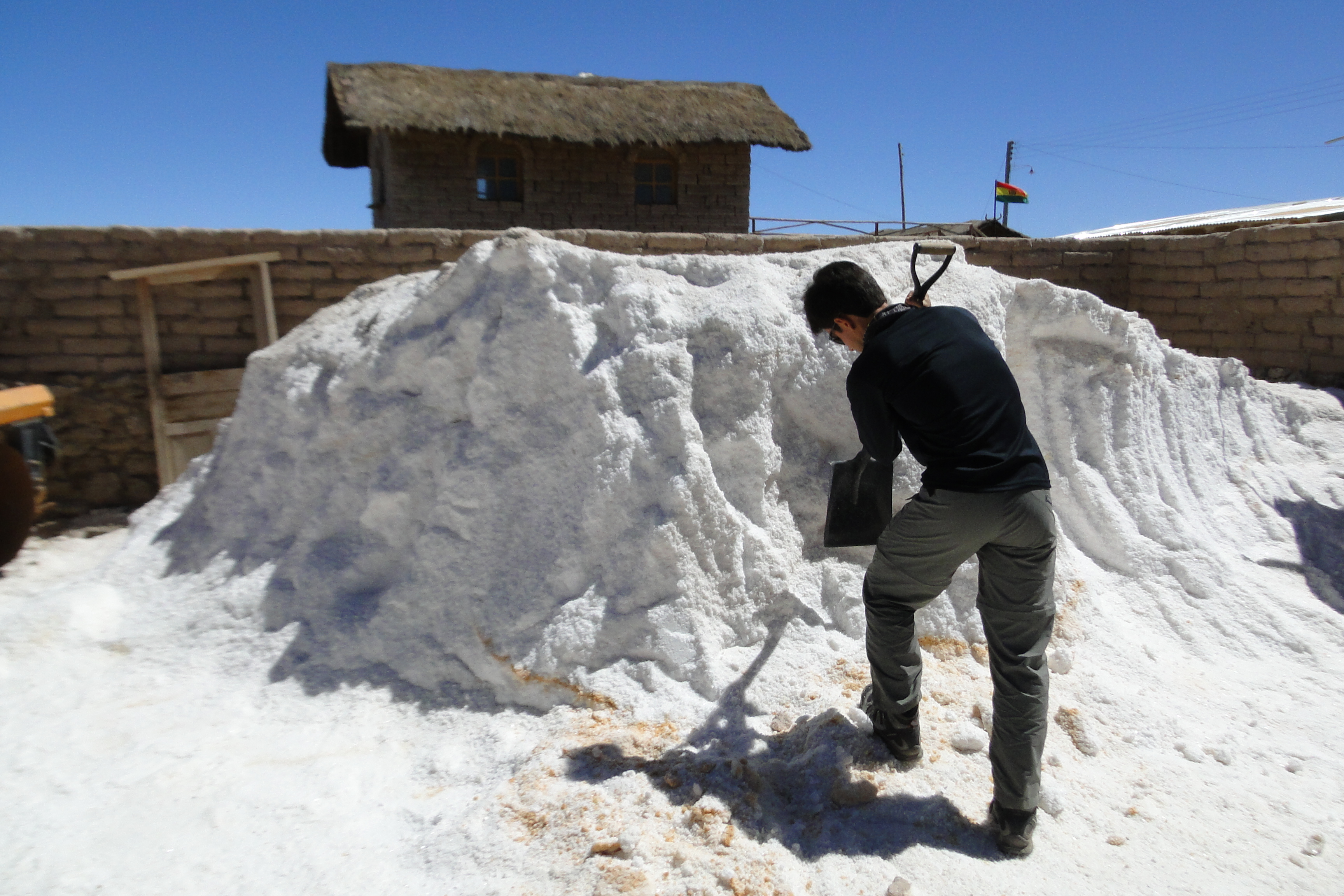 Una media hora mas tarde, llegamos a Colchani, un pueblo situado a orillas del gran salar que basa su economía en la producción de sal. Vimos como las personas locales extraen la sal de la planicie solo raspando la parte superficial, para luego someterla a un proceso de secado que tarda varias semanas. La molienda del mineral se hace en máquinas hechizas con partes de las antiguas locomotoras y ahí mismo le añaden el Yodo y lo empacan para su consumo final.