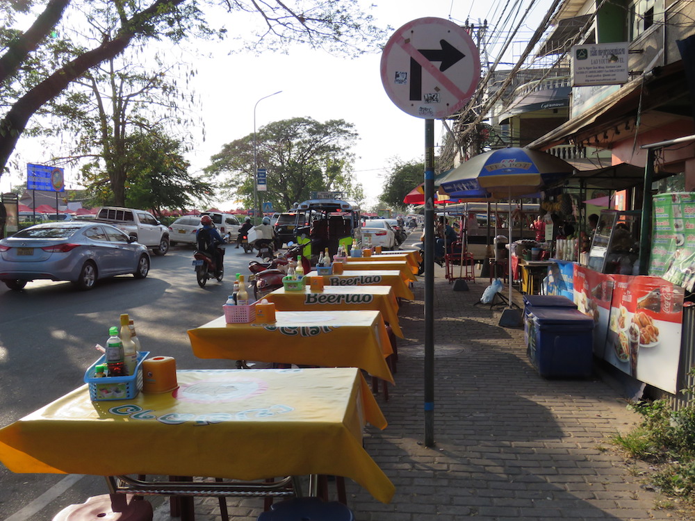 El día había comenzado bastante temprano (tomamos un vuelo de Yangón a Bangkok y de ahí otro a Vientián), pero teníamos mucha hambre y salimos a buscar rápidamente el almuerzo. Lo primero que admiramos de la ciudad fueron sus calles limpias, el tráfico tranquilo (a pesar de que estábamos en el centro) y especialmente, los andenes para caminar. Es divertido cómo cosas tan sencillas nos hacían sentir felices, sólo porque habíamos carecido de ellas las últimas dos semanas en Myanmar.